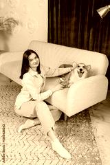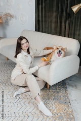 In a delightful scene, a joyful woman is seen thoroughly enjoying moments spent with her wonderfully playful corgi while cozily lounging on a soft and inviting sofa, highlighting their special bond
