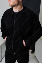 A stylish casual outfit featuring a black zipup jacket, perfect for contemporary fashion enthusiasts who appreciate comfort and elegance. This ensemble is ideal for various settings and occasions