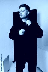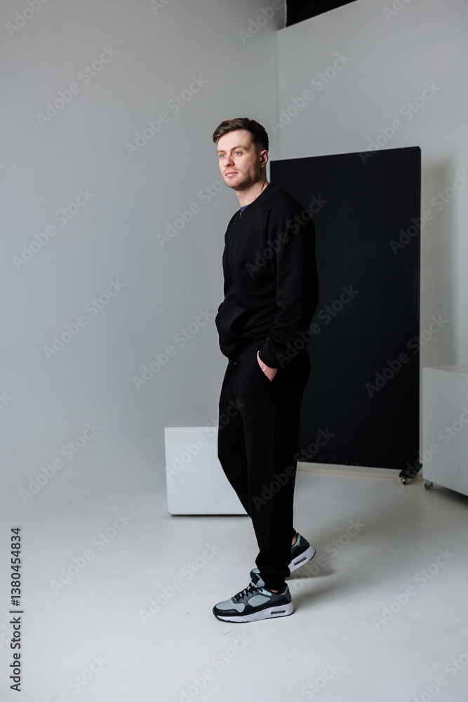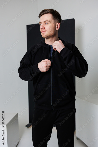 A young man stars in a stylish photoshoot showcasing a sleek black sports jacket that blends modern elegance with creativity, set against a chic backdrop, creating an inspiring fashionable look