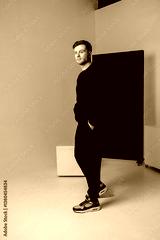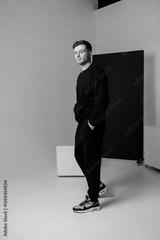 A fashionable young man in sophisticated black attire poses confidently against a minimalistic background, showcasing his impeccable style, poise, and refined taste with expert craftsmanship