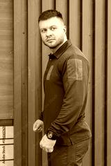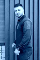 A stylish man is seen in an urban environment, proudly wearing trendy olive green clothing. He poses confidently against a contemporary wooden wall, exuding an aura of sophistication and coolness