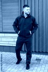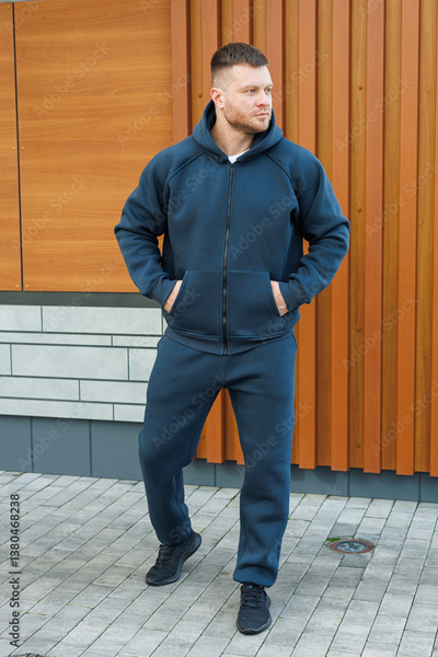 A stylish and athletic man confidently showcases fashionable lounge wear in front of a chic, sophisticated backdrop, effectively capturing the essence of the very latest sportswear fashion trends