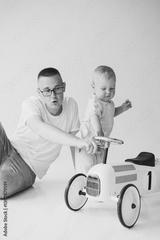 A Playful Bond A Father Actively Engaging with His Toddler Through a Classic Toy Car, Creating Moments of Joy and Laughter Together, while Celebrating the Innocence of Childhood and Family Life