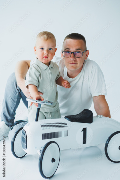 A Father and Child are enjoying a special bonding moment while playing together with a charming vintage rideon car, set against a modern studio backdrop that enhances their joyful experience