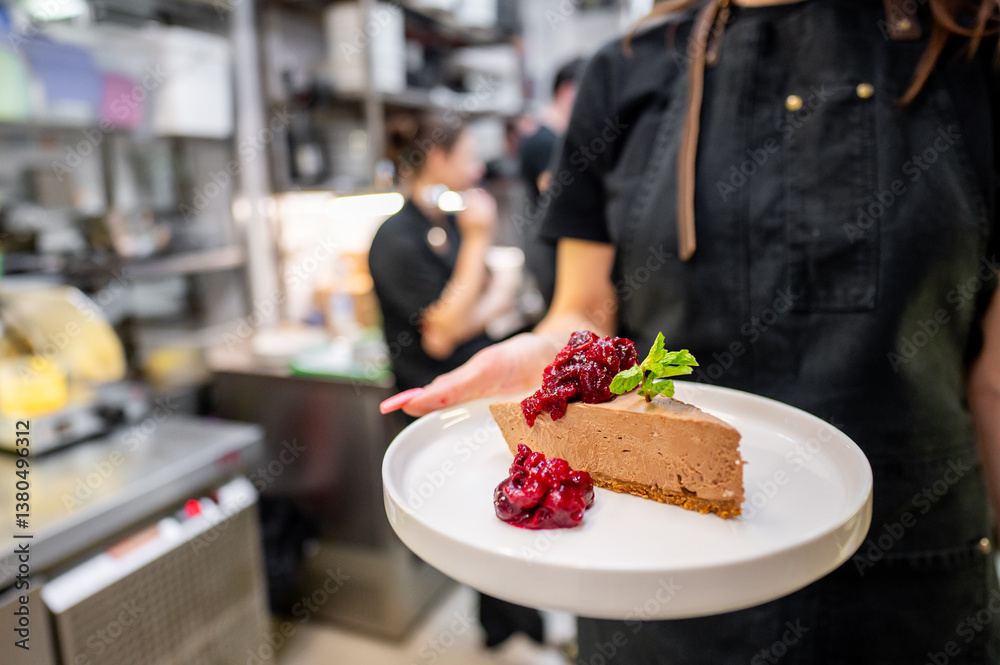 A person wearing a black apron holds a plate with a slice of rich chocolate cheesecake, topped with berry compote and a fresh mint sprig, in a professional kitchen.