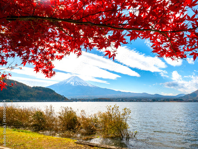 Sights of Japan. Lake Kawaguchiko. Mount Fuji. Red maple leaves in Japanese landscape. Nature of Yamanashi province. Travel to mount Fuji. Fujiyama volcano behind lake. Excursions in Japan