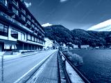 Lake Kawaguchiko in Japan. Tourist hotels along road. Nature of Japan. Landscape of Yamanashi province. Architecture of city of Fujikawaguchiko. Kawaguchiko under blue sky. Empty city street in Japan