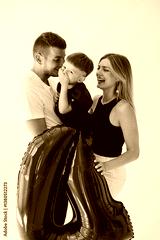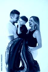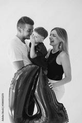 In a heartwarming family moment, parents are joyfully celebrating together with their child, who is holding a colorful balloon, creating a beautiful atmosphere filled with love and happiness