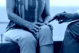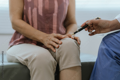 Doctors examine an elderly patient who is suffering from knee pain due to arthritis. The patient is being assisted in his recovery, with an emphasis on pain management and improving mobility.