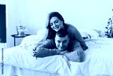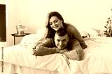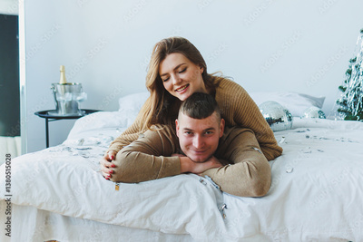 A Joyful Couple Celebrating Their Togetherness in a Cozy Bedroom Adorned with Festive Decor and Surrounded by Warm Embraces, Filling the Space with Cheerful Moments of Happiness and Love