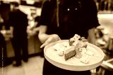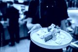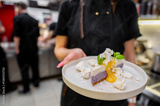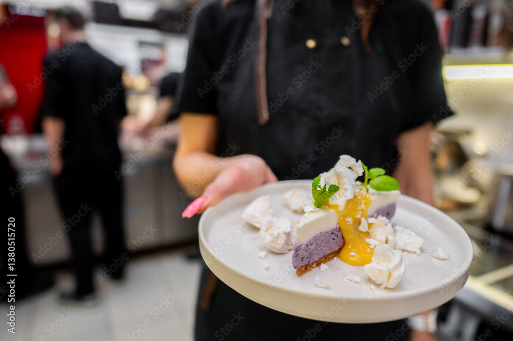 A professional chef presents a plated dessert with purple and white mousse, yellow sauce, mint leaves, and meringue pieces. The background features a bustling kitchen with chefs at work.