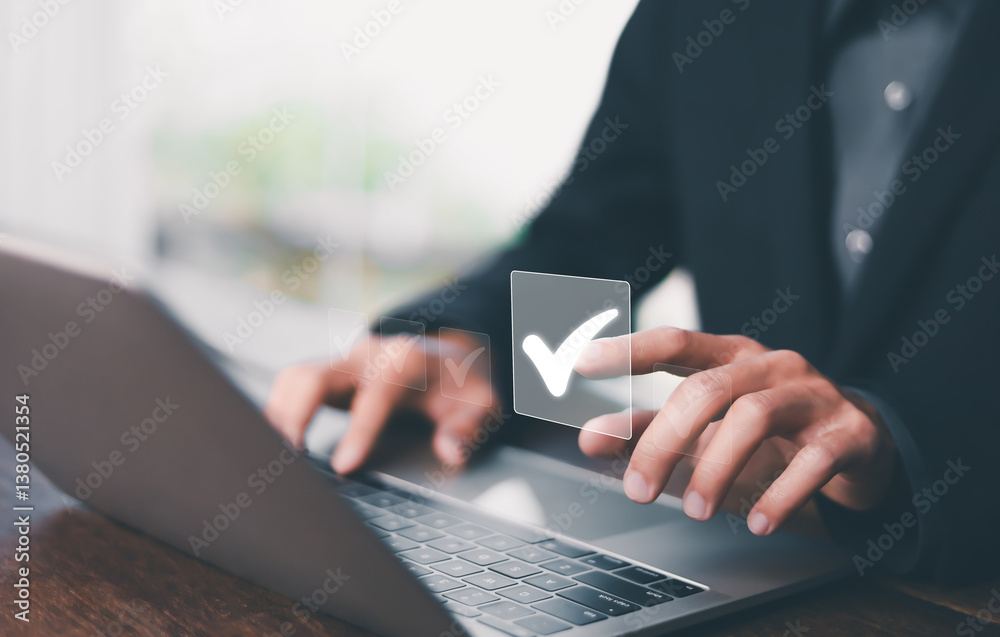 Business Performance Checklist Businessman Using Laptop Doing Online Checklist Survey On Computer Filling Out Digital Form Checklist Survey Doing Assessment Questionnaire Evaluation