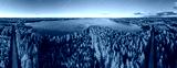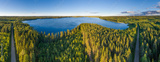 Aerial view in panorama format over boreal forest with lake in central Finland