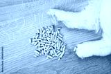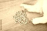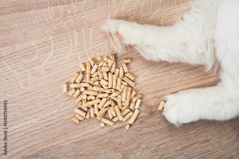 A cat paw is shown near spilled wood pellets on a clean floor. The close-up captures the tidiness and attention to detail in the environment.