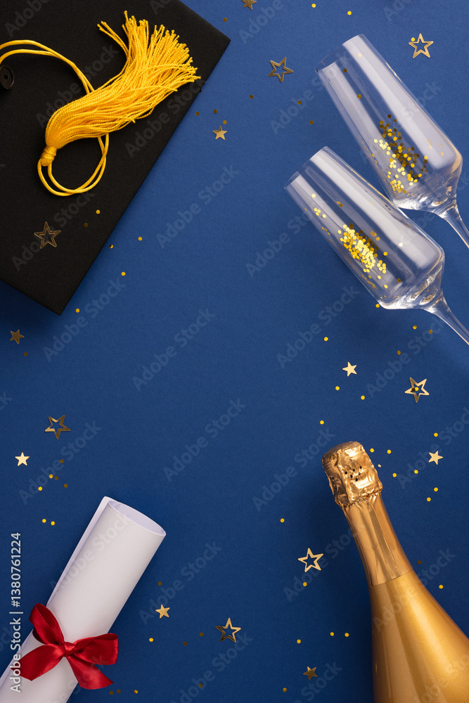 Graduation-themed vertical setup with mortarboard, diploma, champagne bottle, and glasses on sparkling surface