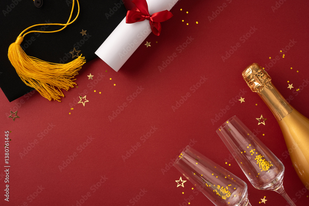 Bright imagery featuring a graduation cap, diploma, champagne, and glitter, symbolizing achievement and festivity
