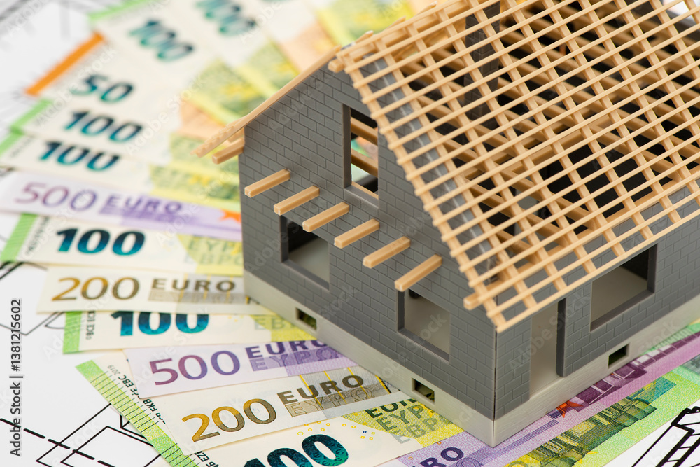 Ein Modellhaus steht auf vielen Euro Banknoten als Symbol für die Baufinanzierung
