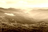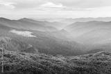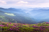 Evening scene with a mountain meadow filled with blossoming rhododendron flowers and mountain ranges with cloudy sky. Spring mountains