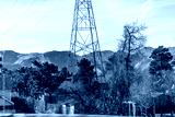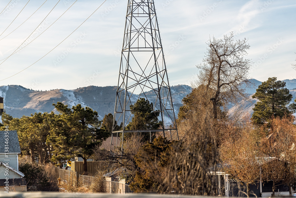 Denver, Colorado Golden suburbs outskirts with telephone tower and background of snow capped rocky mountains