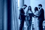 Business team analyzing data on tablet in modern office
