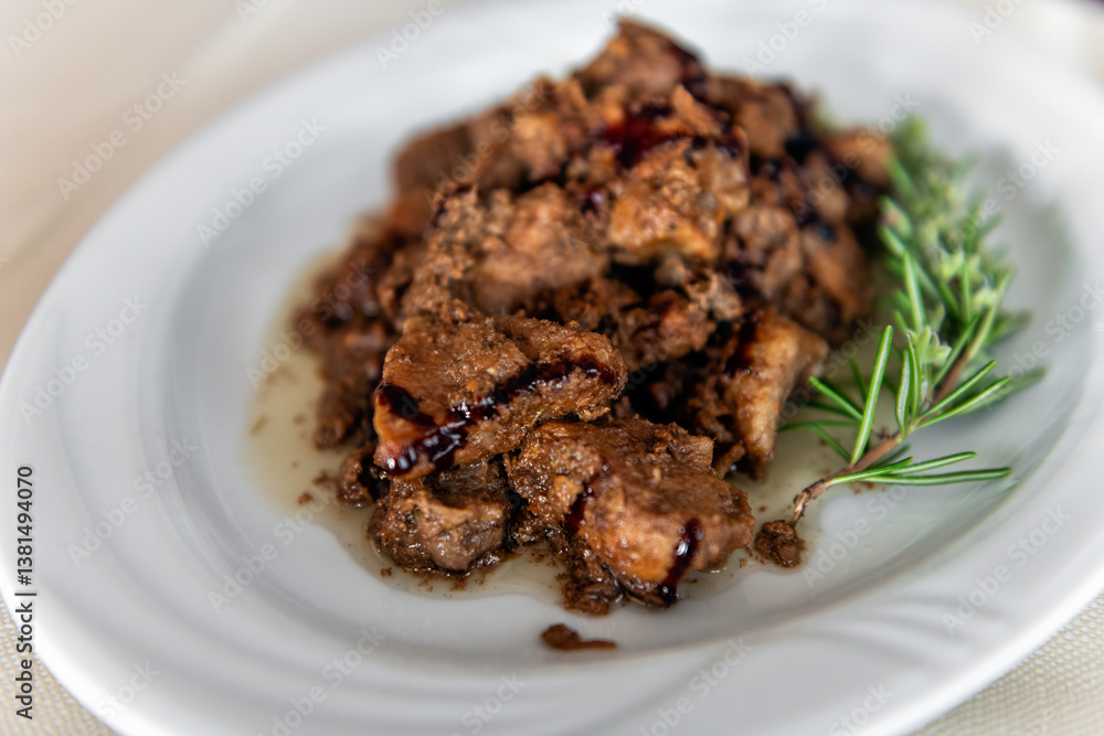 Wild boar pork meat morsels pieces in balsamic vinegar sauce, rosemary herbs on white plate as traditional dish in Sardinia