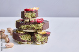 Dubai chocolate. Indulgent layers of chocolate, pistachio, and delicate berries create a sweetly satisfying scene, perfect for confectionary dreams or culinary blogs.