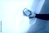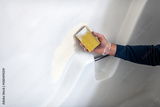 Man inside bathroom tub wall white painted plastic doing remodeling renovation cleaning, resurfacing sanding the peeling paint