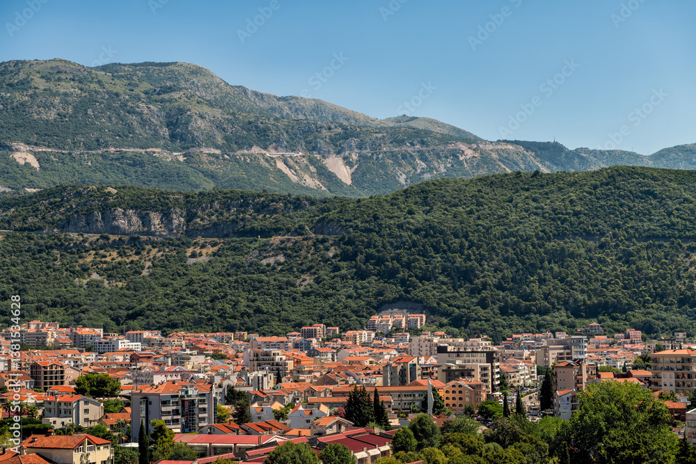 Budva Montenegro cityscape skyline view on canyon mountains, high angle aerial landscape by roof rooftops of residential buildings in summer