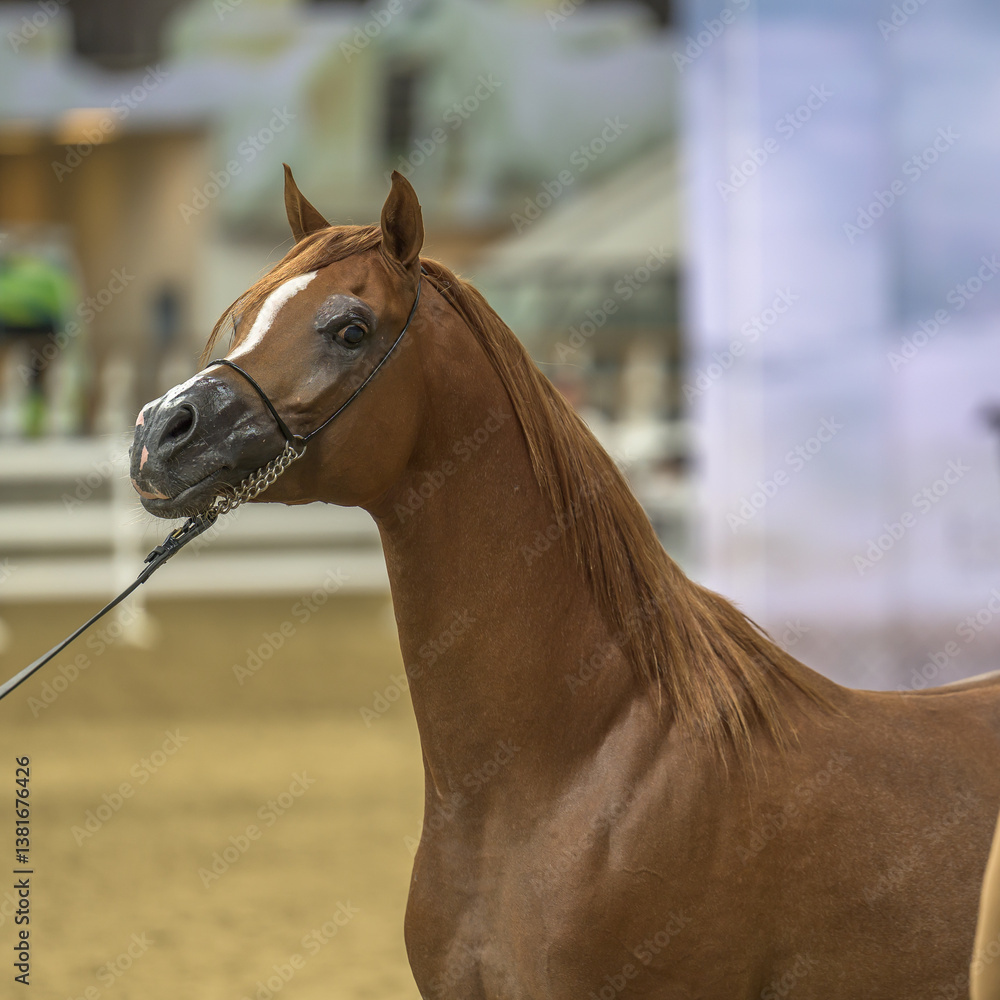 Doha Qatar October 27.2023: Side view of an Arabian horse standing at the Thoroughbred Arabian Horse Festival.
