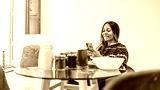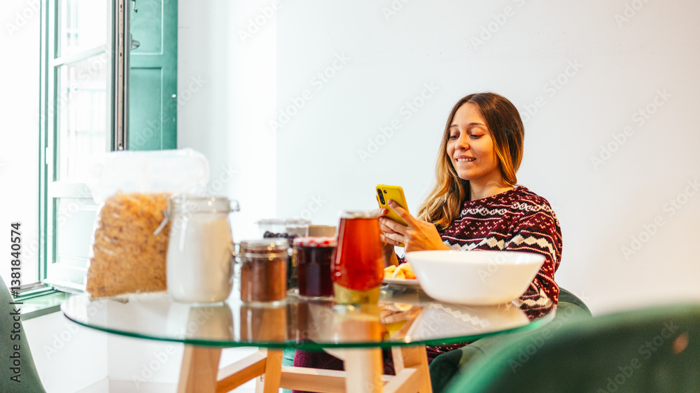 Smiling woman using smartphone and having breakfast at home