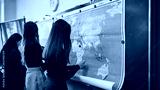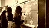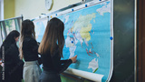 High school students are learning geography, positioning markers on a large world map hanging on the blackboard
