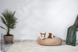 A Jack Russell terrier lies curled in a round dog bed near a leafy potted plant. The calm white space gives a peaceful atmosphere.