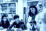 Science teacher explaining human anatomy using anatomical model of liver to two elementary age students during biology class
