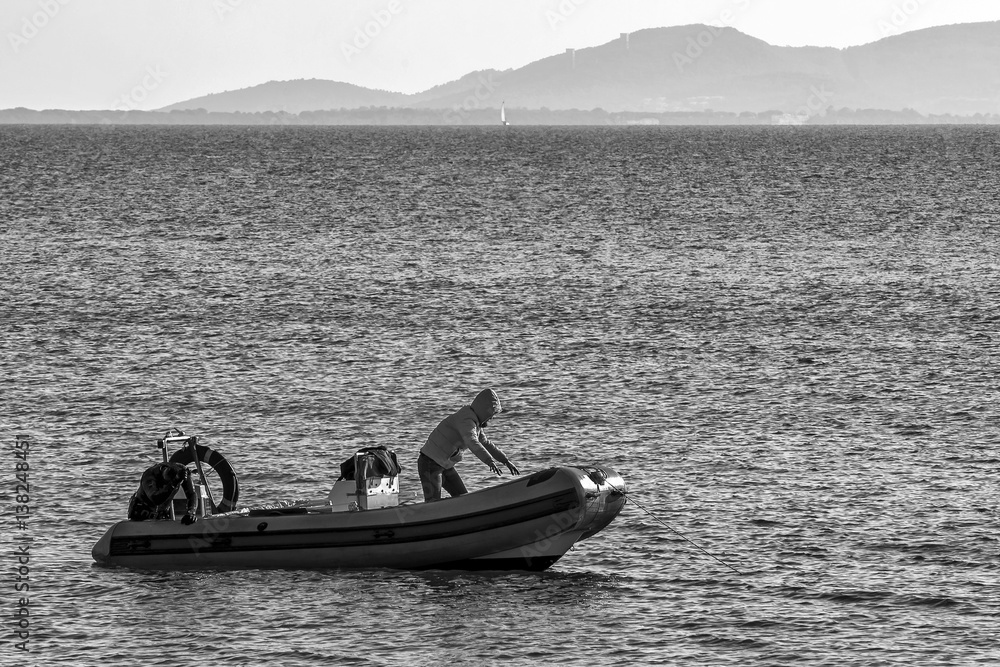 Scuba diver on rubber dinghy prepare to dive in water in front of the coast of Talamone, in winter, Grosseto, Tuscany, Italy, in black and white