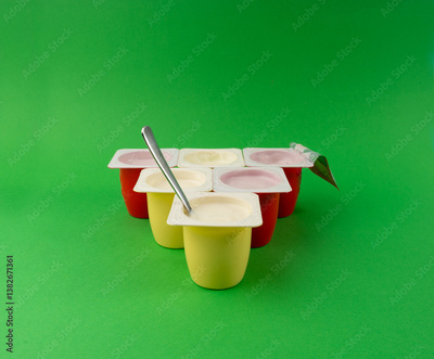 Yogurt cups set, pink and yellow fruit yoghurt in plastic pots, milk pudding container with spoon