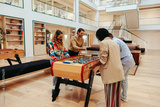 Colleagues enjoying a fun game of foosball in a modern office setting