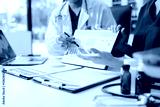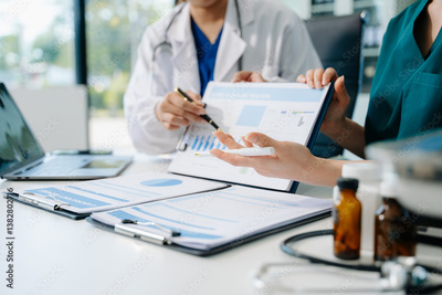 Medical team having a meeting with doctors in white lab coats and surgical scrubs seated at a table
