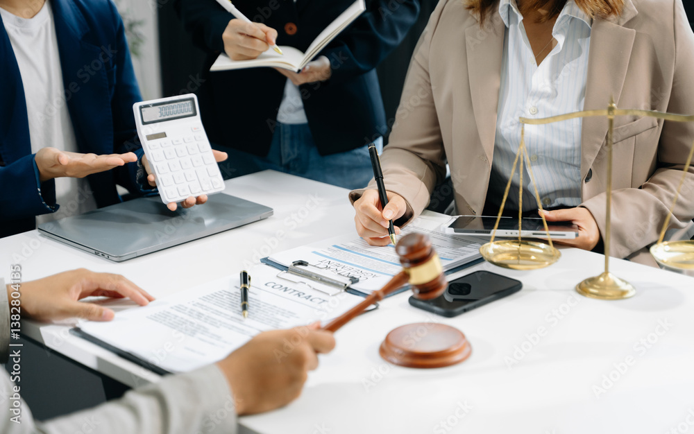 business people and lawyers discussing contract papers sitting at the table. Concepts of law, advice, legal services.