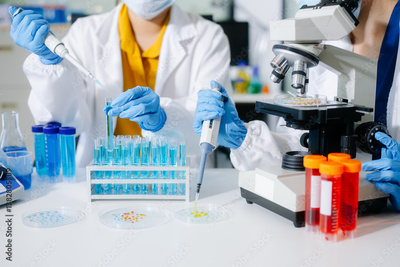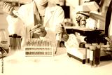 scientists in lab coats conducting research, handling glassware, and working with chemicals