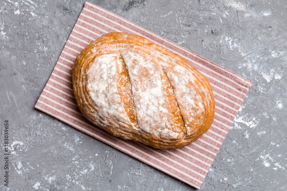 Freshly baked delicious french bread with napkin on rustic table top view. Healthy white bread loaf