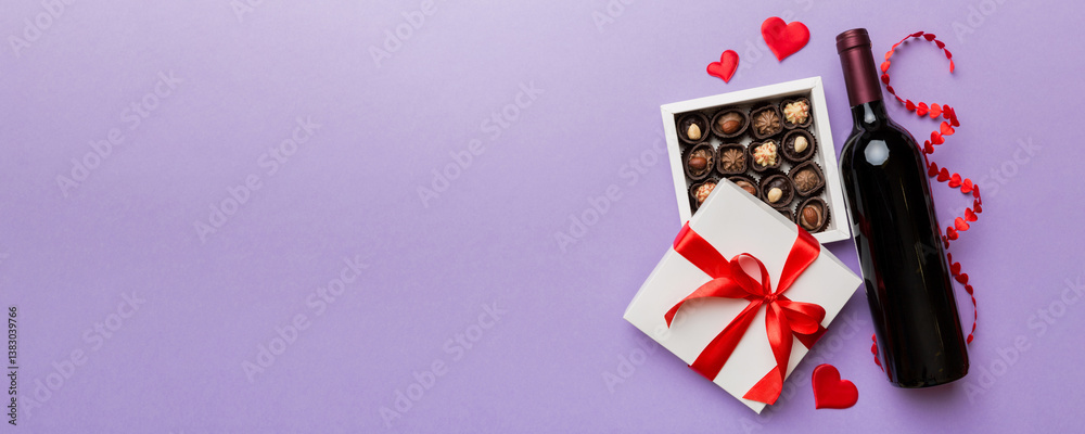 Bottle of red wine on colored background for Valentine Day with gift and chocolate. Heart shaped with gift box of chocolates top view with copy space