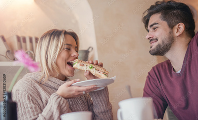 Beautiful young couple sitting in a cafe, having breakfast. Love, food, lifestyle