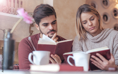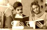 Young couple drinking coffee and reading a book in the cafe. Education, relationships, love concept