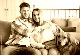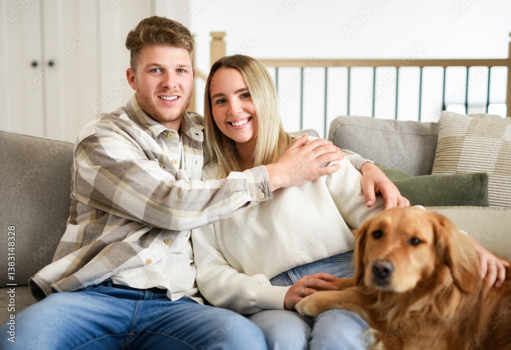 Portrait of a young couple on the livingroom with golden retriever dog indoors at home.