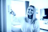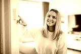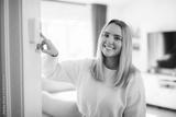 Smiling woman using modern smart home system, controller on wall