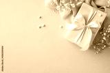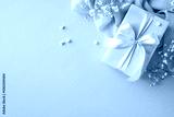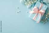 Decorative image featuring a delicate gift box adorned with pink ribbon and surrounded by flowers, set on a light blue backdrop to convey celebration, love, and thoughtful appreciation
