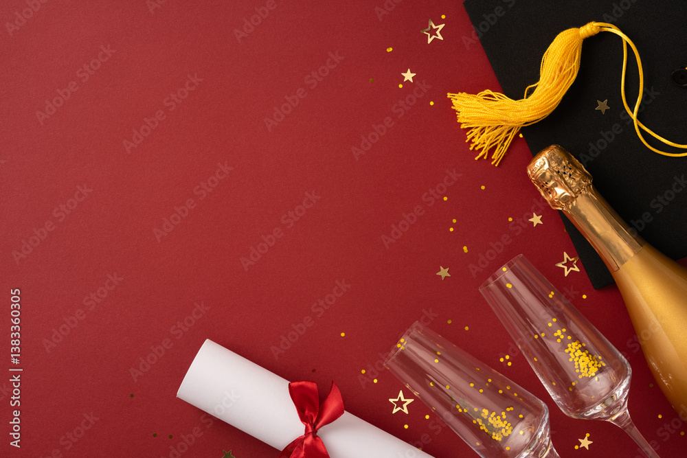 Festive setup includes a graduation cap with tassel, champagne bottle, flutes, and diploma scroll arranged on a vibrant red backdrop