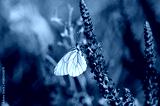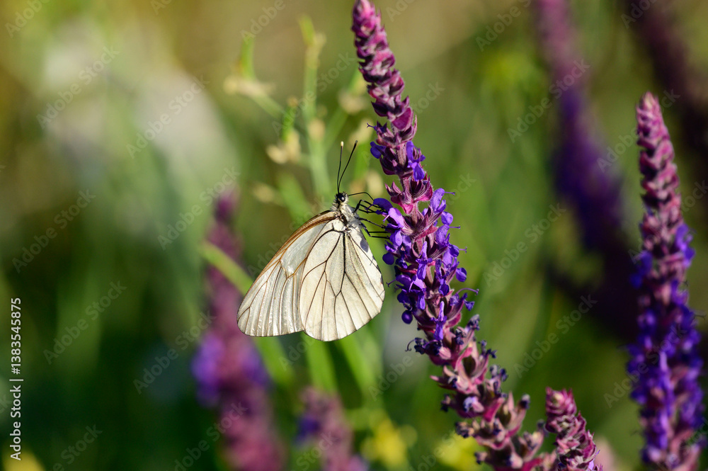 Macro Shot of Violet Salvia nemorosa Flowers with Black-Veined White Butterfly Aporia crataegi in Summer Meadow