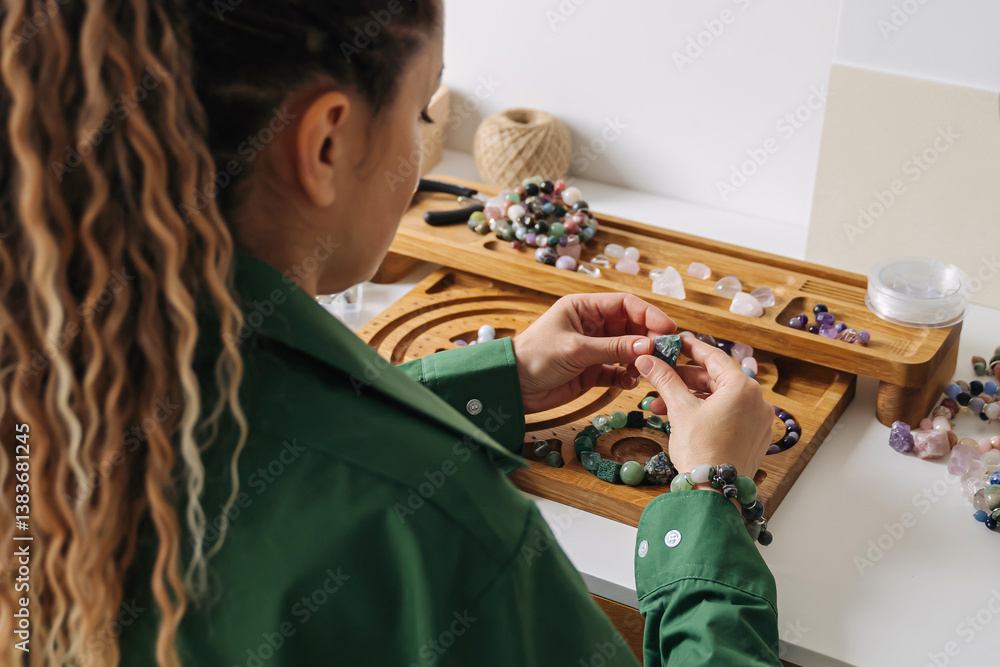 Woman crafting handmade gemstone bracelets at home. Artisan creating crystal healing bracelets. Natural stone. Crafting spiritual jewelry.