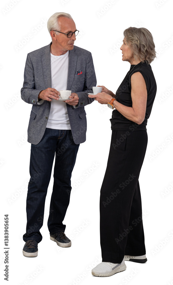 Two older grey-haired people standing and drinking coffee during a conference break. Isolated on transparent background